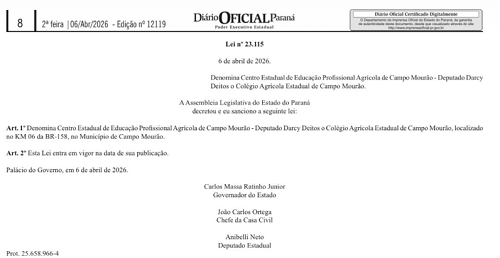 Agora é oficial: o Colégio Agrícola de Campo Mourão se chama “Deputado Darcy Deitos”.