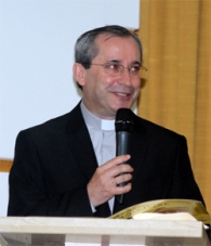 Padre Jurandir Coronado Aguilar, pároco paróquia de São José, após saudar as autoridades presentes na sessão solene da Câmara de Campo Mourão que entregou a Comenda 10 de Outubro à paróquia; neste sábado.