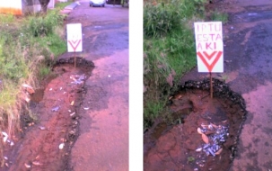 “Em meio a tantos protestos, uma nova placa de trânsito aparece na rua Antônio Bueno de Camargo. Essa "cratera" na rua está lá há mais de uma ano e nada foi feito. Ela só aumenta com passar do tempo”. Camila