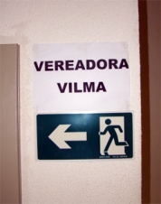 Responda rápido: O que significa essa placa? A vereadora Vilma Terezinha está correndo do povo? O povo precisa correr atrás da vereadora? Nada disso. Na verdade, são duas placas. A debaixo informa o sentido para se achar o acesso à Câmara. A de cima, com o nome da vereadora, é só a demarcação da vaga dela na garagem do legislativo. Viu só, nem precisou de Freud pra explicar..