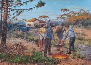A obra “O Surgimento do Carneiro no Buraco”, pintada pelo artista Saulo Pfeiffer, foi entregue nesta quinta-feira à prefeitura de Campo Mourão. Foi em cerimônia no gabinete do prefeito Douglas Fabrício. O quadro em óleo sobre tela mostra a retirada do tacho do prato típico por pioneiros, numa paisagem da cidade quando a iguaria começou a ser preparada no início da década de 1960. O quadro ficará exposto no Museu.