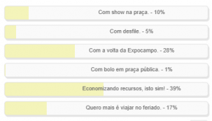 “Como Campo Mourão deveria comemorar os 78 anos, no mês que vem?” Enquete com essa pergunta foi encerrada neste domingo. Vitória da alternativa “Economizando recursos, isto sim”, com 39% dos votos. “Com a volta da Expocampo” ficou em segundo, com 28%. “Quero mais é viajar no feriado” fechou em terceiro, com 17%. O resultado completo está no quadro acima.