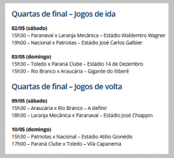 A Federação Paranaense de Futebol divulgou nesta segunda-feira a tabela das quartas-de-final da Segundona.