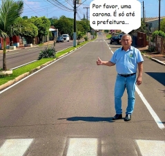 O que é isso? O prefeito de Quarto Centenário, Akio Abe, pedindo carona até a prefeitura? Calma. O balãozinho é uma obra de ficção. Como a prefeitura está pintando faixas de pedestres e redutores de velodidade, o prefeito foi dar uma conferida e sinalizou que gostou do que viu...