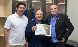 O Conselho Regional de Contabilidade do Paraná prestou homenagem ao empresário Denir Daleffe, do Grupo Cometa, de Campo Mourão. Motivo? Mais de 50 anos de registro ativo na instituição federal da categoria profissional. Alberto Barbosa e Cléber Roberto Francioli, conselheiro e delegado representante do CRCPR na região, respectivamente, fizeram a entrega do diploma.