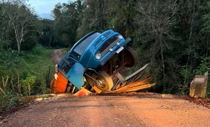 A ponte, que tinha sido refeita há cerca de um mês, não suportou o peso do caminhão carregado de milho.