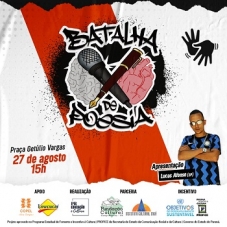 Campo Mourão recebe neste sábado (15h) a Batalha de Poesia. Será na praça Getúlio Vargas. Vão participar alunos que fizeram as oficinas oferecidas pelo projeto de Maringá. Eles apresentarão poemas autorais de até três minutos de duração, sem acompanhamento musical e sem uso de adereços, figurinos ou objetos cênicos. A premiação é em livros literários e troféus.