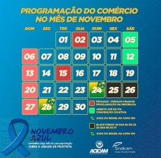 A Acicam divulgou o calendário de novembro para o comércio de Campo Mourão já lembrando que vai começar a Copa do Mundo. Portanto, além dos feriados dos dias 2 (Finados) e 15 (Proclamação da República), tem a estreia do Brasil no dia 24 (quinta-feira, 16h) e o segundo jogo no dia 28 (segunda, 13h).