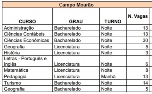 A Unespar abriu Processo Seletivo para preencher as vagas remanescentes do Vestibular 2023. As inscrições podem ser feitas até 23 de fevereiro. A seleção será de forma remota e gratuita, por meio das notas do Enem ou de vestibulares realizados pela universidade em 2019, 2020 e 2021. Ao todo, são 390 vagas para mais de 30 cursos de graduação, sendo 110 em Campo Mourão (veja acima).