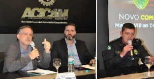 O prefeito de Campo Mourão, Tauillo Tezelli, e o novo comandante do 11º BPM, major Willian Silveira, foram os convidados especiais, nesta quarta-feira, da reunião mensal da Acicam. Tauillo falou da volta da Festa Nacional do Carneiro no Buraco. Silveira, claro, abordou questões de segurança pública e recebeu pedido do presidente da Acicam, Ben-Hur Berbet para ações contra furtos em empresas. O presidente da Câmara, Edilson Martins, também participou da reunião.