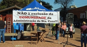 A retirada do Conselho da Comunidade do estatuto da Santa Casa de Campo Mourão continua rendendo. Neste sábado, o grupo entitulado "Amigos da Santa Casa" montou barraca no calçadão para protestar, com direito a faixas e discursos. Teve apoio do Conselho Municipal de Saúde, inclusive com a participação da presidente Lenilda de Assis. Ela questionou a exclusão do Conselho da Comunidade às vésperas da eleição na entidade.