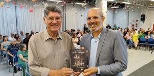 Biblioteca Municipal de Campo Mourão lotada nesta sexta-feira à noite para o lançamento do livro "Opala Milagroso", a quarta obra de Osvaldo Broza. Assim como os três primeiros, o livro traz crônicas, contos e poemas. Segundo o autor, a data de lançamento foi escolhida em homenagem aos 76 anos de Campo Mourão (10 de outubro), cidade que é uma de suas paixões. Na foto, Broza, o livro e o presidente da Fundacam, Roberto Cardoso.