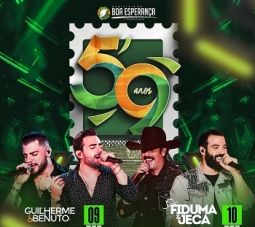 Boa Esperança – Dois shows serão realizados neste fim de semana dentro da programação pelos 59 anos do município. No sábado tem Guilherme & Benuto e, domingo, Fiduma & Jeca. Será no Parque do Lago, com entrada franca.