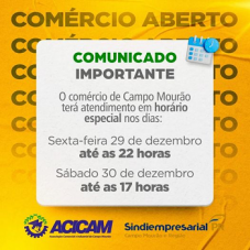 O comércio de Campo Mourão atenderá em horário especial neste fim de semana.