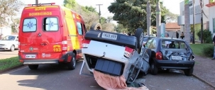 Olha aí um carro de rodas para cima em pleno centro de Campo Mourão. O acidente aconteceu na tarde desta quarta-feira, na av. Goioerê. O Uno que aparece no clic foi atingido por carro que invadiu a preferencial, capotou e ainda bateu no Corsa que estava estacionado. Duas pessoas se fereriam. Segundo o Mapa da Violência, o trânsito de Campo Mourão é nono mais violento do Brasil. Deixa até São Paulo pra trás.