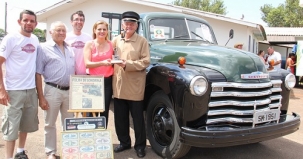 Silvestre Minikowski, de Faxinal, todo faceiro com o seu caminhão Chevrolet 1951, ao lado da prefeita Regina Dubay. Minikowski é esse aí que parece o marinheiro Popaye.