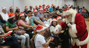 Na hora da banda e do Papai Noel, todos colocaram gorros vermelhos na cabeça.