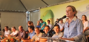 A ministra Gleisi Hoffmann fez referência à Estrada Boiadeira ao discursar em Quarto Centenário.