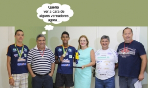 O clic é desta terça-feira, quando o treinador Paulo César Costa e os atletas Luan Henrique e Pablo Gabriel foram apresentar troféus e medalhas conquistados na Copa Brasil/Caixa de Marcha, em Navegantes/SC. Na hora da foto, teve medalha para o coordenador geral Carlos Garcia e para o secretário Ricardo Echelmeir (Esportes), além de troféu para a prefeita Regina Dubay.