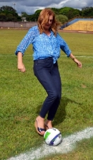 A prefeita Regina Dubay esteve no estádio Roberto Brzezinski neste domingo à tarde. Era a abertura do Amadorzão da Liga de Campo Mourão, com o jogo América x Quinta do Sol. O prefeito quintassolense João Cláudio Romero também prestigiou, mas só a mourãoense teve direito ao pontapé inicial. E olha que ela estava de tamanco com saltão anabela, hein?...