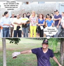 Os cliques são deste sábado, na região do jardim Pio 12, onde aconteceu mutirão de combate ao mosquito da dengue. Na hora da abertura, a prefeita Regina Dubay esteve por lá, assim como o vereador Toninho Machado. O secretário Edoel Rocha (Fiscalização), que já foi vereador e é atual primeiro suplente, pôs a mão na massa e saiu recolhendo lixo pelo bairro.