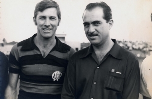 Bellini, o capitão do Brasil na Copa de 1958, que morreu nesta quinta-feira, aos 83 anos, já jogou em Campo Mourão. Foi em 13 de outubro de 1968, num amistoso comemorativo pelos 21 anos da cidade. Já em final de carreira, Bellini atuava pelo Atlético Paranaense, que venceu a Mourãoense por 7 a 3 no estádio Roberto Brzezinski. Na foto, o craque ao lado do então prefeito Augustinho Vecchi.