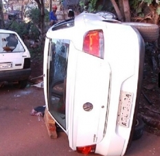 Um carro ficou tombado em acidente neste domingo à tarde, no perímetro urbano de Campo Mourão. O Voyage bateu numa moto e num Fiat Uno antes de virar. Desta vez foi no jardim Aeroporto. A condutora não tinha carteira de motorista.