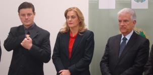 Na hora de compor o quadro de autoridades, a prefeita ficou no meio de Bueno e do presidente da Câmara, Pedrinho Nespolo.