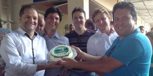 Uma das novidades do leilão deste ano na Festa da Solidarieda foi o "bolo dos partidos". Isso mesmo: foram feitos bolos padronizados com as logomarcas dos partidos políticos. Olha o bolo do PSC aí, sendo mostrado pelos pré-deputáveis do partido Osni Menezes e Márcio Nunes. O vereador Edson Battilani tratou de arrematar o bolo do PPS. Ah, o que não pode é deixar cair nas mãos dos adversários...