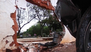 Descanse em paz desse jeito! Um carro bateu no muro do Cemitério Municipal São Judas Tadeu neste sábado à tarde. A PM fez o teste do bafômetro e constatou embriaguez do motorista, que foi preso. O condutor, no entanto, culpou um buraco na rua. Menos mal que naquele ponto o muro não é ossário. Já pensou, ser atropelado depois de morto...