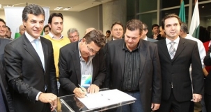 O governador Beto Richa assinou nesta segunda-feira a liberação de recursos para dar uma mãozinha para nove prefeituras providenciarem seus planos diretores. Uma delas foi de Corumbataí do Sul, que vai receber R$ 50 mil. O prefeito Carlos Caxão e o vice-prefeito Xandão Donato participaram doe evento. O deputado Wilson Quinteiro também está na foto.