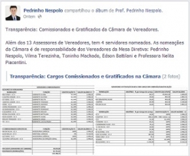 O presidente Pedrinho Nespolo divulgou no fim de semana a lista de todos os cargos em comissão da Câmara.
