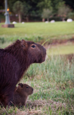 Inseparáveis, capivara-mãe e capivara-filha observam a paisagem no Parque do Lago, em Campo Mourão.