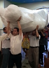 ...é de barro? Não! O São José de cinco metros de altura que será colocado em cima da Catedral de Campo Mourão é de fibra de vidro. Quando chegou à igreja, na quarta-feira, todo mundo teve que ajudar a levá-la até o altar, a começar pelo padre Adilson Naruishi. "Estou com dor nas costas até agora", frisou nesta sexta. Portanto, devagar com o andor que o santo é de fibra. E padre é de carne e osso...