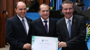 O presidente da Coamo, José Aroldo Gallassini, recebeu nesta quinta-feira o título de Cidadão Honorário do Mato Grosso do Sul. A entrega foi feita pelos deputados Paulo Corrêa e Júnior Mochi (presidente), que foram os autores da homenagem.