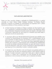 A Rede Feminina de Combate ao Câncer divulgou nota a respeito.