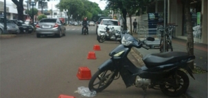 “Loja da av. Capitão Índio Bandeira, no centro de Campo Mourão, usa cestinhas de compras para reservar vaga no estacionamento público. O flagra foi feito por volta das 11h desta terça-feira”.