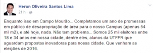 “Completamos um ano de promessas em público de desapropriação de área para nosso Campus e até hoje nada”, escreveu.