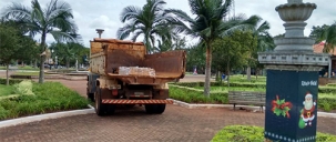 Caminhão caçamba da prefeitura foi levado para a praça Getúlio Vargas na quinta-feira para a virada do ano e quatro dias depois continuava por lá. A foto é do fim da tarde desta segunda-feira. Estragou? Foi esquecido? Foi abandonado? Tá perdido? Acabou o combustível?...