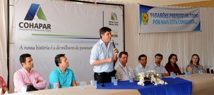 Terra Boa – Cohapar e prefeitura assinaram nesta quinta-feira contratos de construção de 80 casas populares. O investimento será de R$ 3,6 milhões via Caixa Econômica. As casas devem estar prontas em 16 meses e terão parcelas de R$ 150 a R$ 381. O prefeito Valter Peres e o deputado Márcio Nunes participaram.