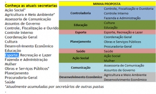 Outras sugestões são para a Assessoria de Comunicação ser absorvida pela Coordenação Geral; Controle Interno se juntar a Controle, Fiscalização e Ouvidoria; Cultura e Esporte numa pasta só e o Planejamento subordinado à Coordenação Geral.