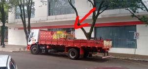 Tá certo que o flagra foi feito por volta das 7h, quando o trânsito ainda é bem tranquilo, mas assim como o caminhão, uma moto poderia chegar e precisar do estaciaomento. A placa diz que o local é para estacionar motos.