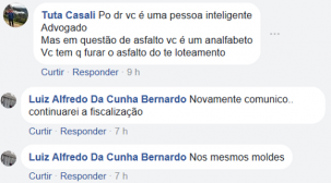 O vereador Luiz Alfredo e o empresário Tuta Casali voltaram a "conversar" pelas redes sociais nesta quarta-feira. O assunto, é claro, o recape das ruas. Luiz Alfredo postou sobre sua polêmica fiscalização e Casali comentou que o vereador era inteligente, mas "um analfabeto" sobre asfalto. O parlamentar respondeu que continuará fiscalizando "nos mesmos moldes".