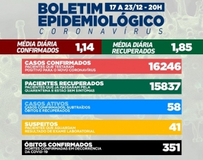 Nos últimos sete dias apenas oito novos casos de covid-19 foram confirmados em Campo Mourão. A média diária ficou em 1,14. Os recuperados no período foram 13. O número de casos ativos caiu para 58 e não houve mortes na última semana.
