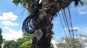 Fios enrolados em árvore no canteiro central da av. Comendador Noberto Marcondes, em frente a Unespar e a Casa da Cultura.