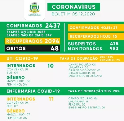 Vinte e sete casos de covid-19 foram confirmados nesta sábado em Campo Mourão. Como houve 15 recuperados, o número de moradores com o vírus ativo subiu para 295. O número de casos suspeitos também aumentou. Foi de 428 para 475. A UTI segue com 100% de ocupação nos leitos do SUS. Na enfermaria caiu para 70%.