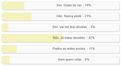 "Horário eleitoral começa dia 26. Você vai assistir?" Enquete foi encerrada neste domingo. Venceu a alternativa "Não. Já estou decidido", com 42% dos votos. Em segundo ficou "Não. Nunca assisti", com 21%. Ou seja, 63% não pretendem acompanhar. "Sim. Gosto de ver" teve 16%. O resultado completo está no quadro acima.