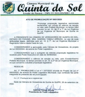 A presidente da Câmara de Quinta do Sol, Sabrina Arruda, promulgou lei que adequa salários de dois cargos da Câmara.