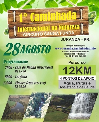 Mais um município da região vai estrear na Caminhada Internacional na Natureza. É Juranda, que realiza no próximo domingo a primeira edição do circuito Sanga Funda. Serão 12 km entre trilhas e estradas rurais. A caminhada, como sempre, é gratuita, mas existem as opções de café da manhã (R$ 15) e almoço (R$ 30). Na manhã desta segunda-feira já havia 157 inscrições feitas.