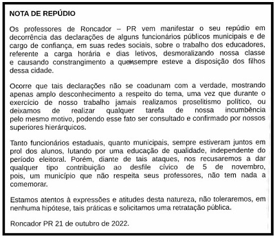 Um grupo de professores da rede estadual enviou "Nota de repúdio" à prefeitura de Roncador.